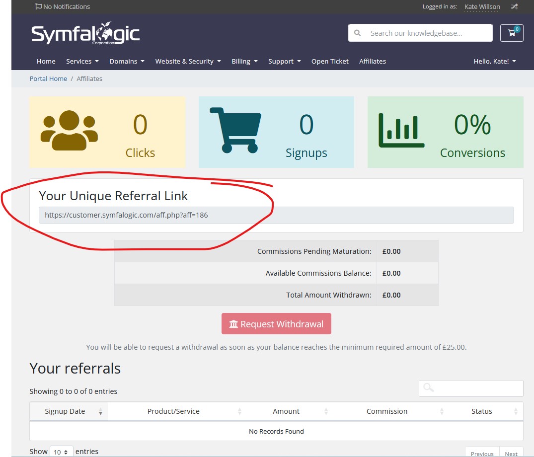 You can always come back to this page, and in this account you can check how many people have signed up with your link, how many they have purchased and what their conversion rate is.